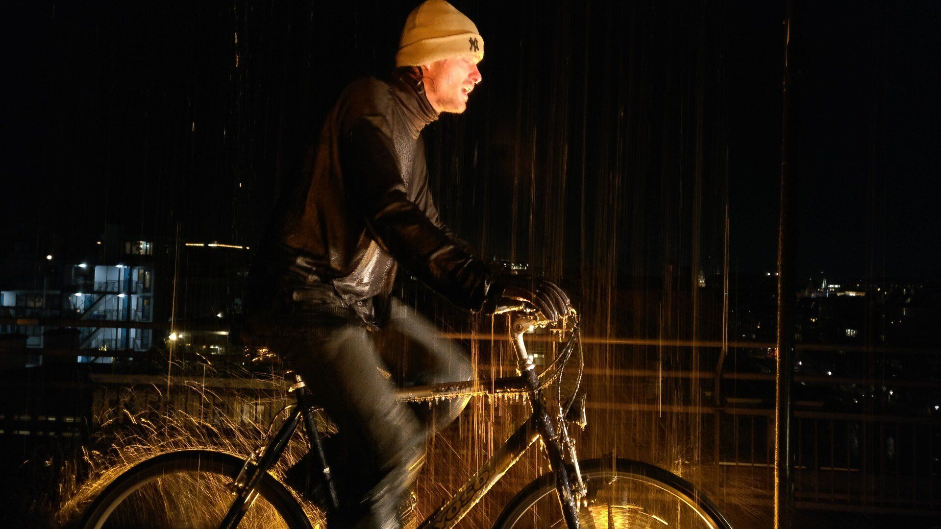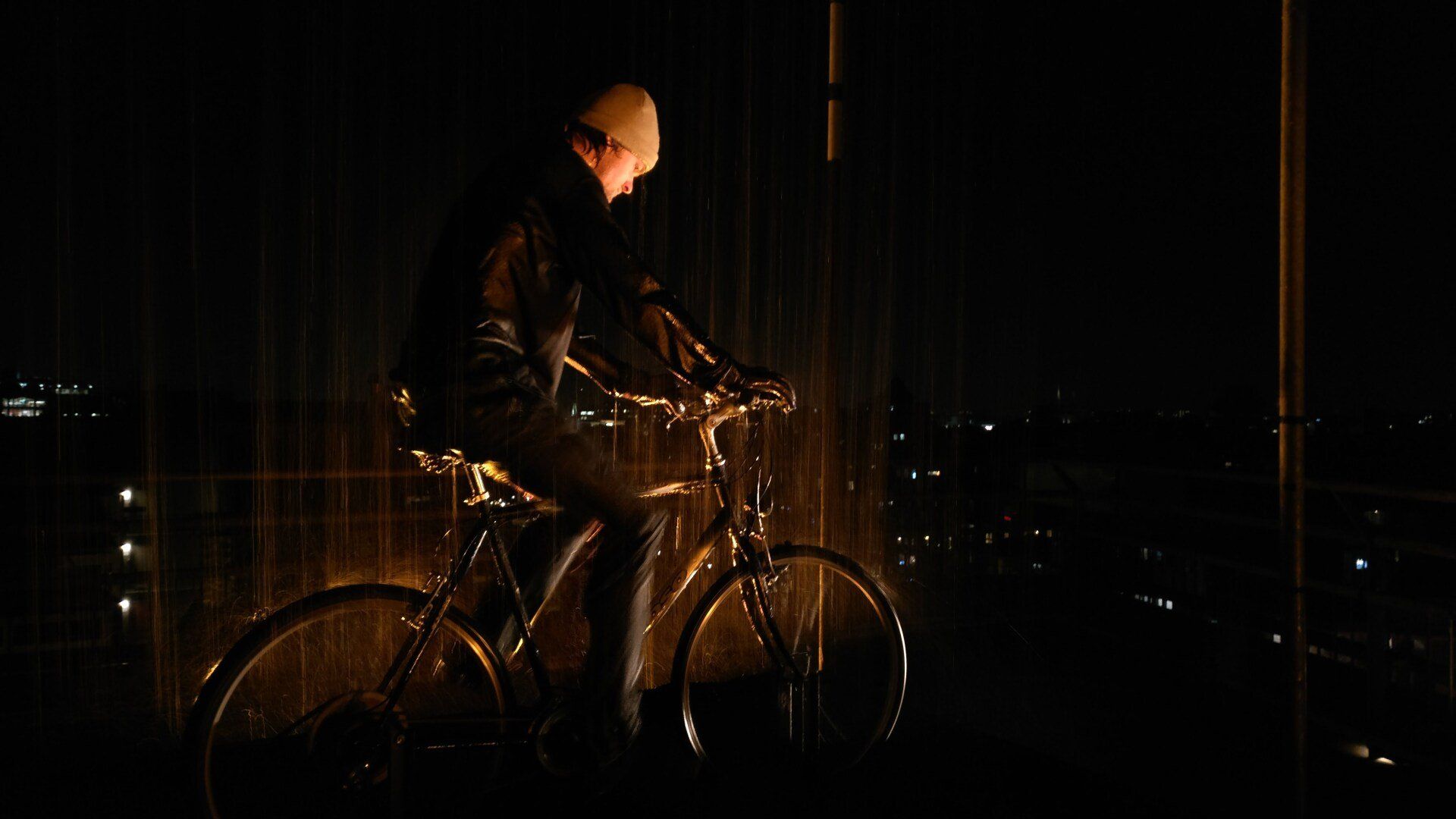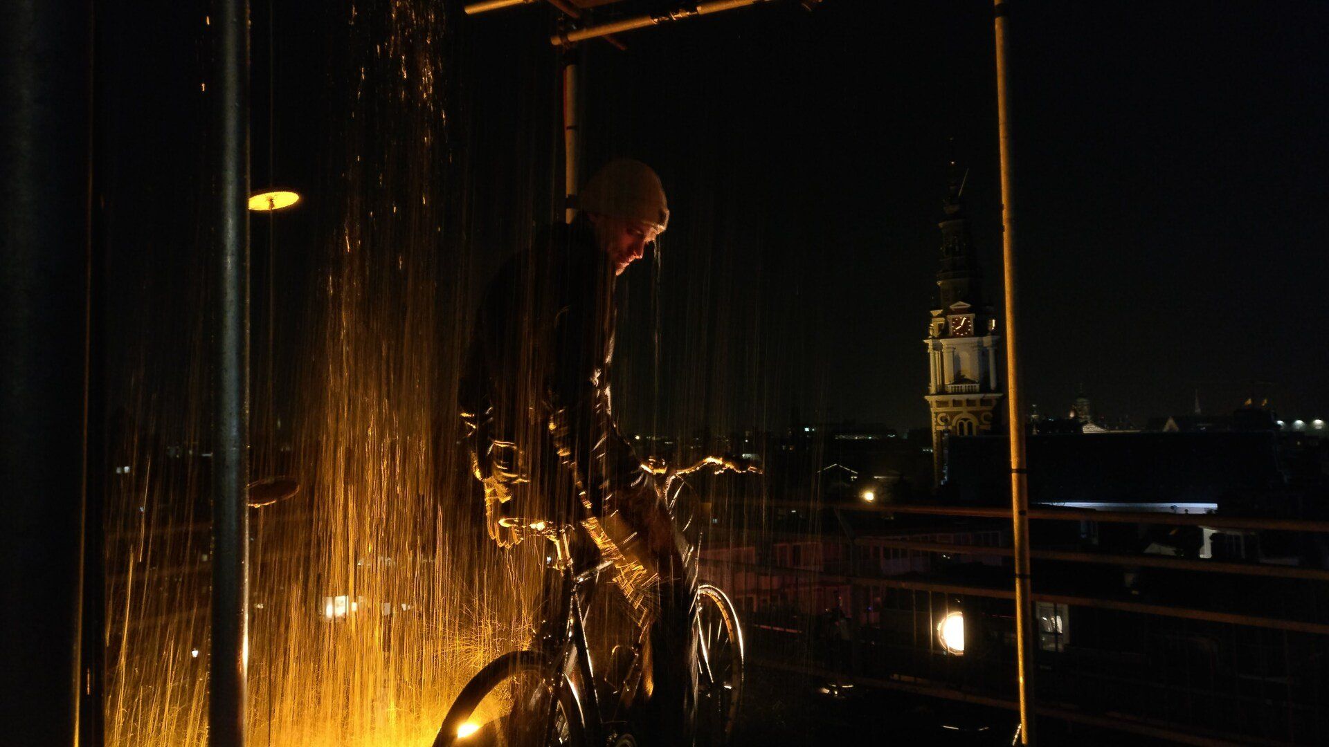 Gone is the graduation solo piece of mime performer Jurriaan de Vos. It's an performance installation in which the main character cycles on a bike, but by doing so pumps water up in the installation what in turn rains back down on him.