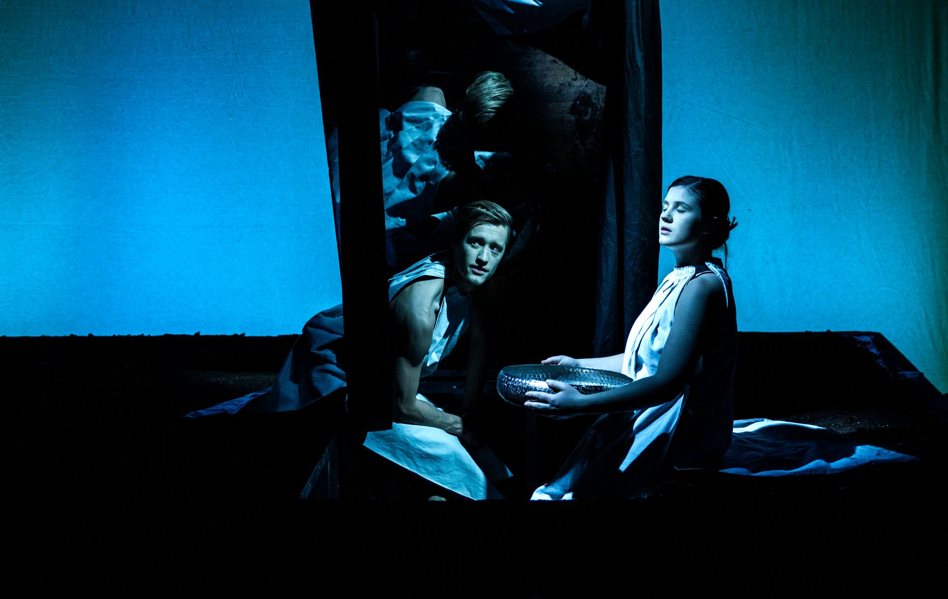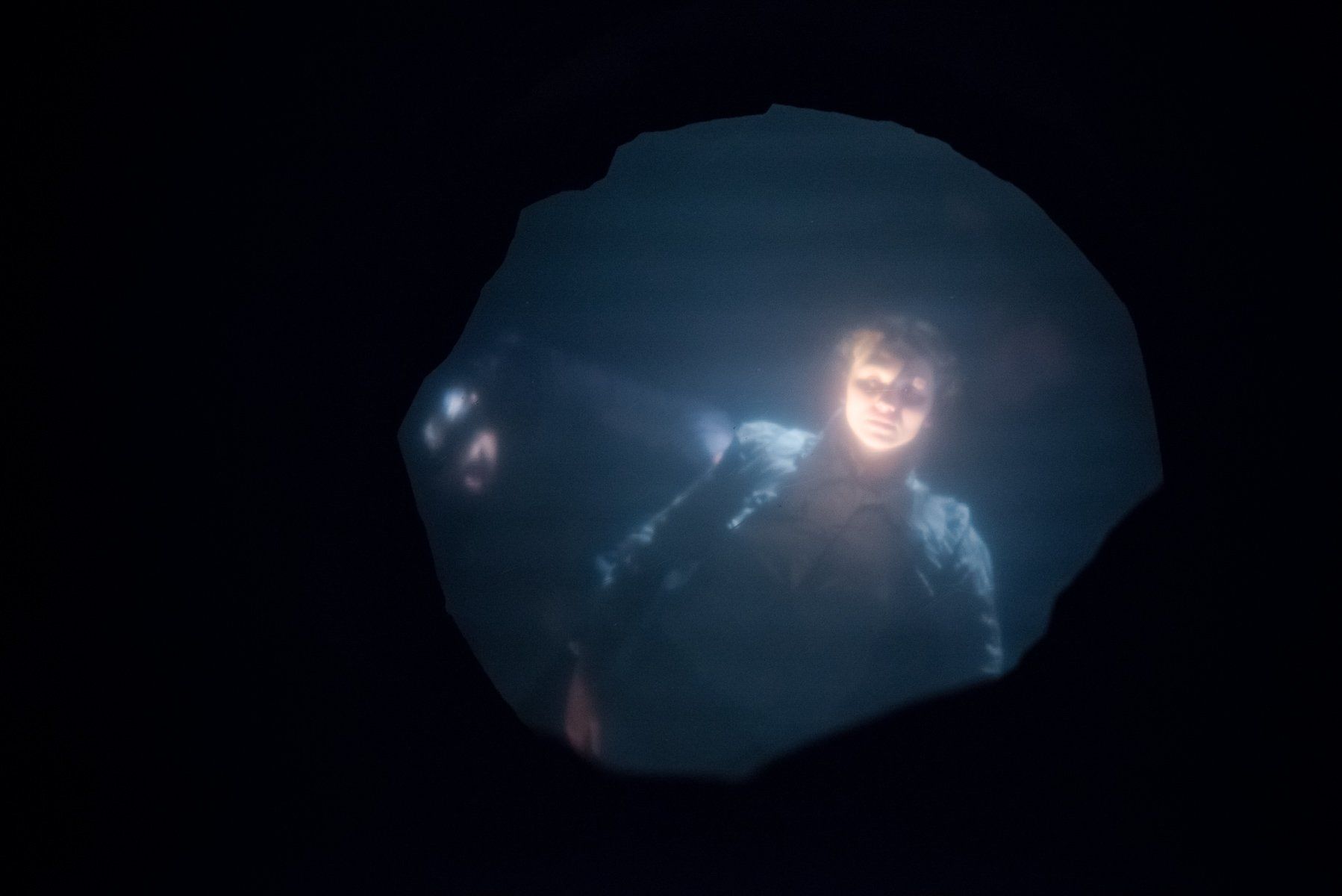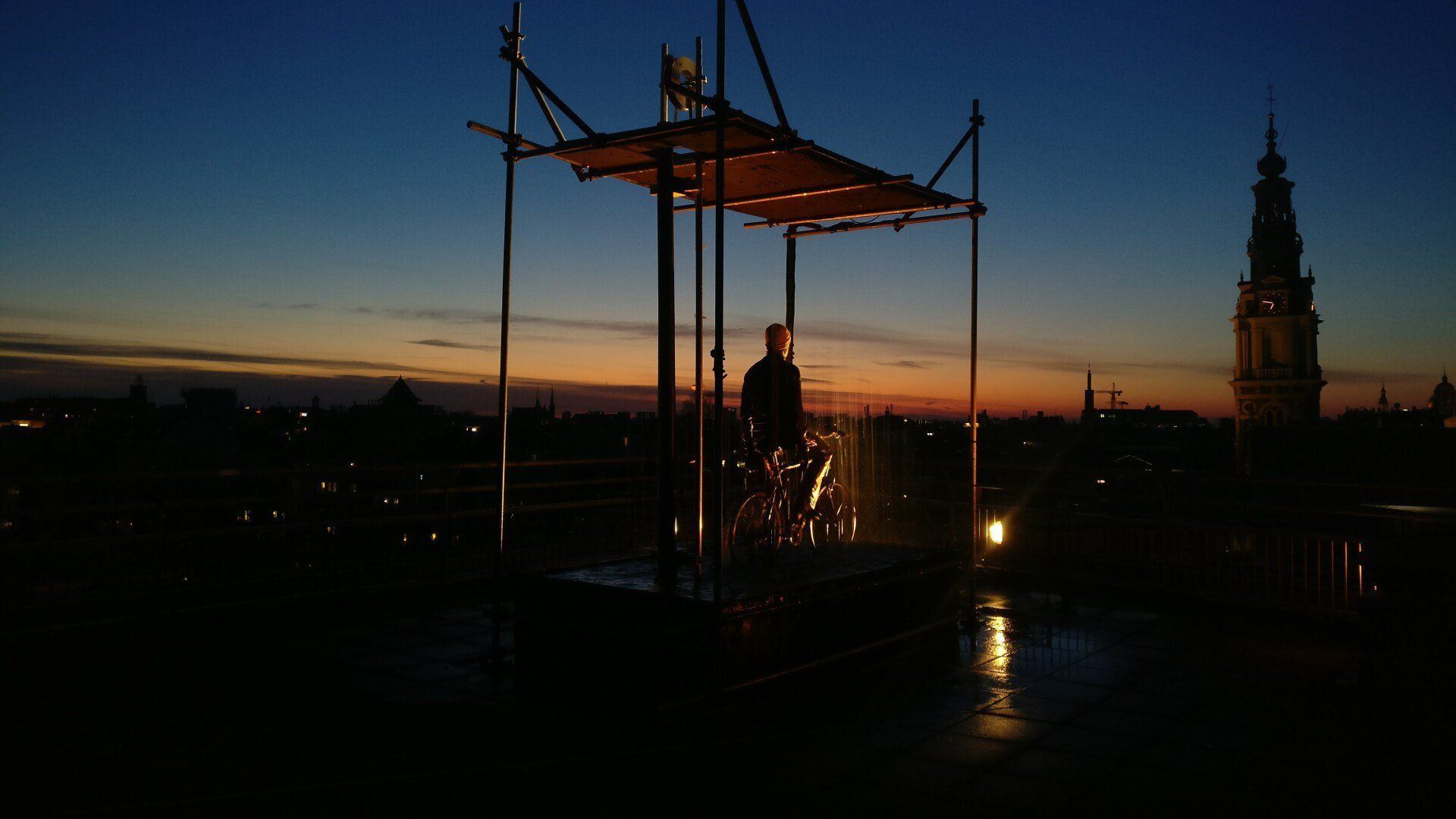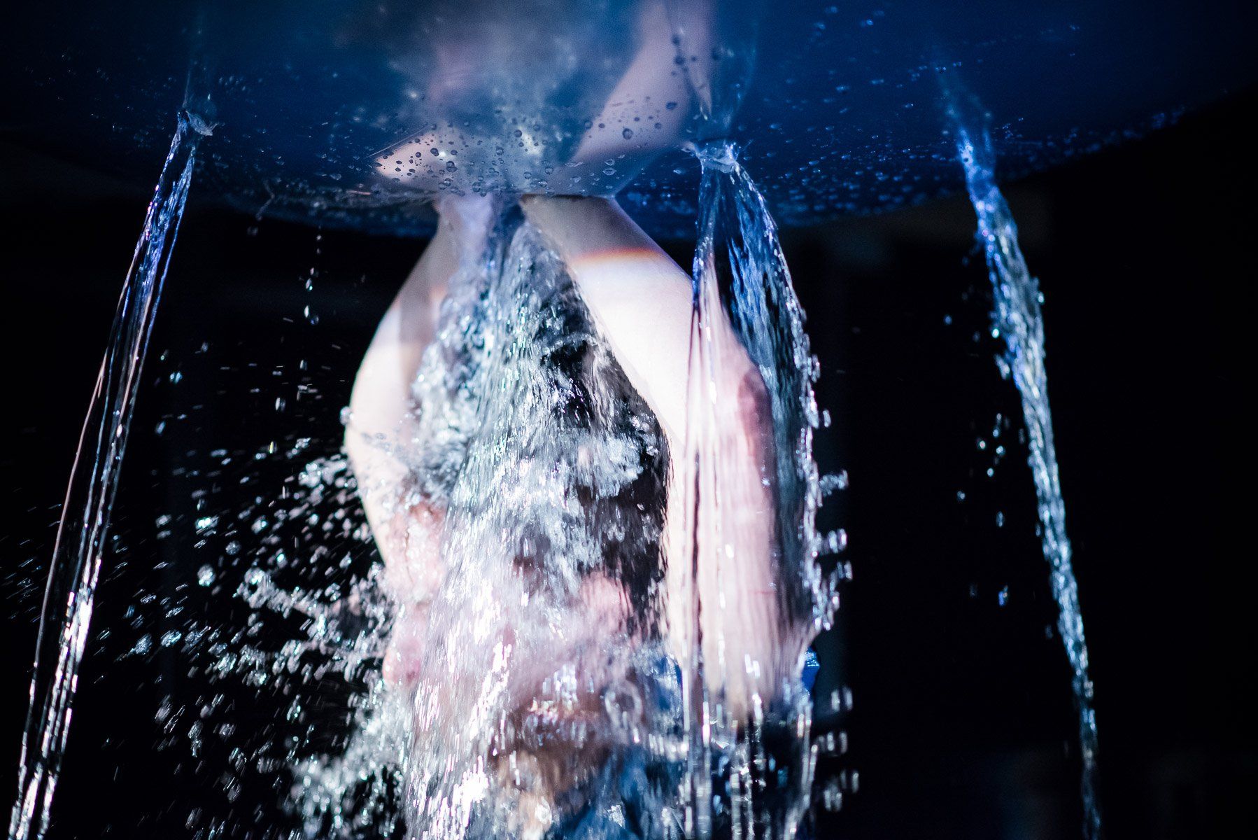 Gone is the graduation solo piece of mime performer Jurriaan de Vos. It's an performance installation in which the main character cycles on a bike, but by doing so pumps water up in the installation what in turn rains back down on him.