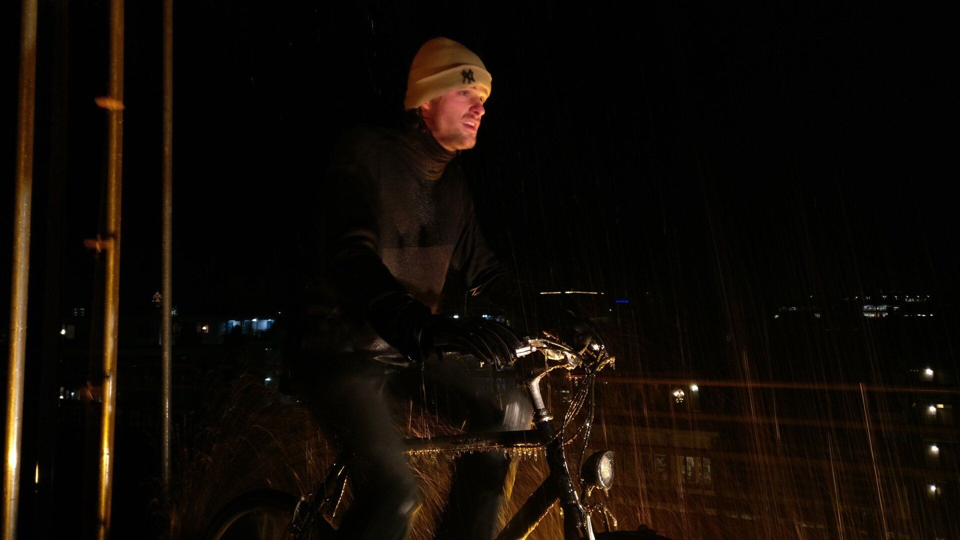 Ice is hanging from the steering wheel of the bike in the winter cold. The faster he tries to get away, the harder it rains.
